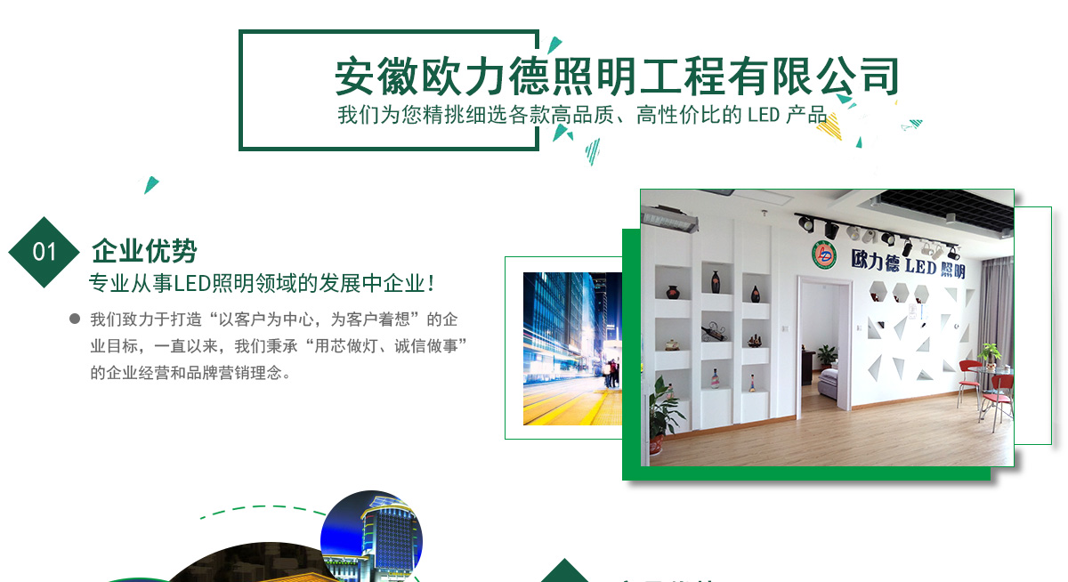 安徽歐力德照明工程有限公司,是一家專(zhuān)業(yè)從事LED照明領(lǐng)域的發(fā)展中企業(yè),公司致力于生產(chǎn)、銷(xiāo)售、維護(hù)一站式服務(wù)。在當(dāng)今LED行業(yè)的不規(guī)范和激烈的價(jià)格戰(zhàn)中,我們致力打造“以客戶(hù)為中心,處處為客戶(hù)著想”的企業(yè)目標(biāo)。一直以來(lái),我們秉承“用‘芯’做燈、誠(chéng)信做事”的企業(yè)經(jīng)營(yíng)和品牌營(yíng)銷(xiāo)理念。我們?yōu)槟艏?xì)選各款高品質(zhì)、高性?xún)r(jià)比的LED產(chǎn)品;我們?yōu)槟峁┖侠淼脑O(shè)計(jì)方案和快速的物流配送;以及施工團(tuán)隊(duì)和完善的售后服務(wù)。我們把對(duì)光明和希望的追求不斷融入到科技創(chuàng)新之中,提供綠色、環(huán)保、LED照明產(chǎn)品和服務(wù)。 我們?yōu)楦黝?lèi)城市景觀(guān)亮化、戶(hù)外照明、室內(nèi)照明提供新穎、環(huán)保、節(jié)能的產(chǎn)品和服務(wù)?! ∥覀儗M(mǎn)足都市環(huán)境的照明效果,并建立高品質(zhì)...